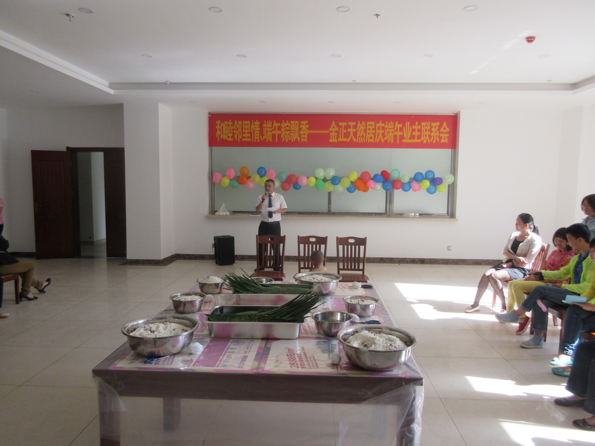 •     為繼承和發(fā)揚民族優(yōu)秀傳統(tǒng)文化,營造和諧社區(qū)氛圍,增強小區(qū)業(yè)主鄰里間感情,豐富小區(qū)業(yè)主業(yè)余文化生活,201668,由金正天然居物業(yè)管理處和天然居銷售部共同主辦、藍天琴行協(xié)辦的天然居慶端午業(yè)主聯(lián)系暨包粽子大賽在天然居小區(qū)食堂成功舉辦,經過前期籌備,活動當天共有40余戶業(yè)主和意向客戶參與包粽子比賽,實際到場100余人。